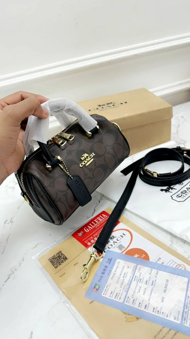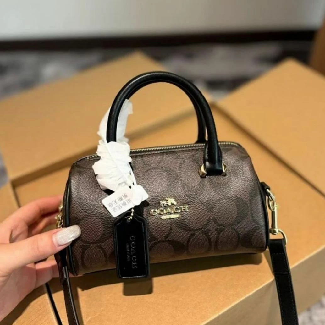 The COACH Mini Satchel Brown Speedy Bag combines luxury with functionality in a compact design. Crafted from high-quality materials, the bag features a rich brown exterior with the iconic COACH monogram pattern, adding a touch of sophistication. The spacious interior ensures you can carry your essentials comfortably, while the adjustable strap offers versatility for shoulder or crossbody wear.