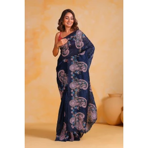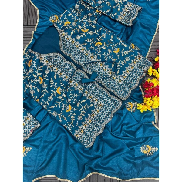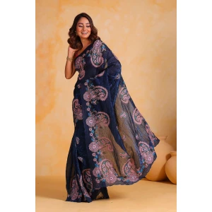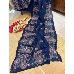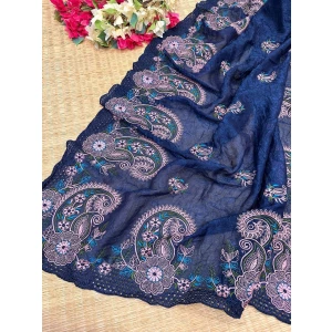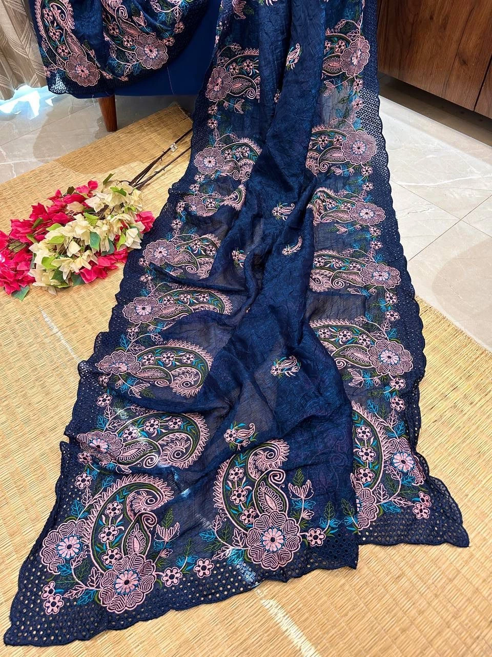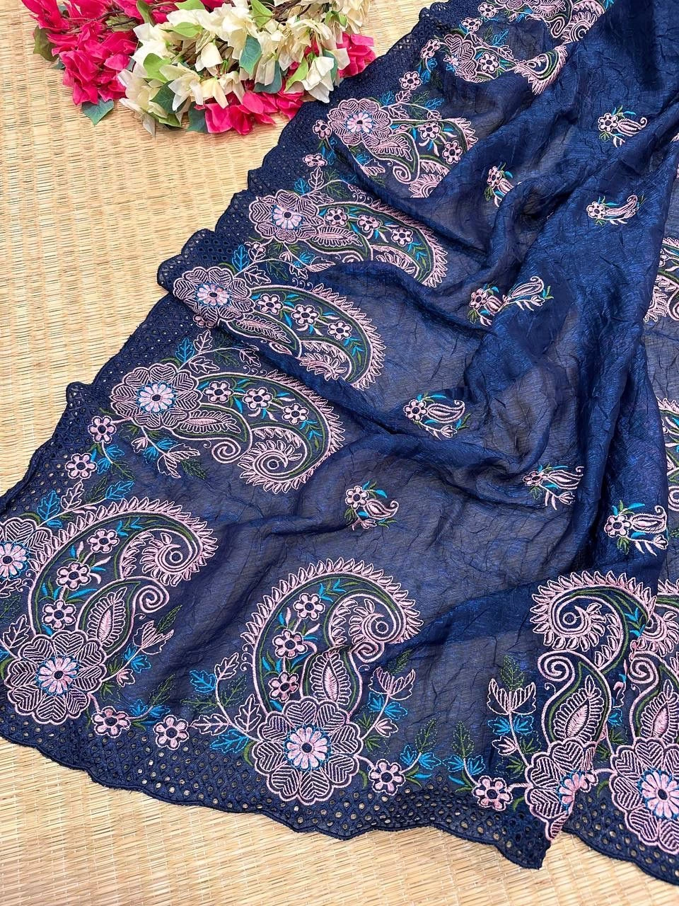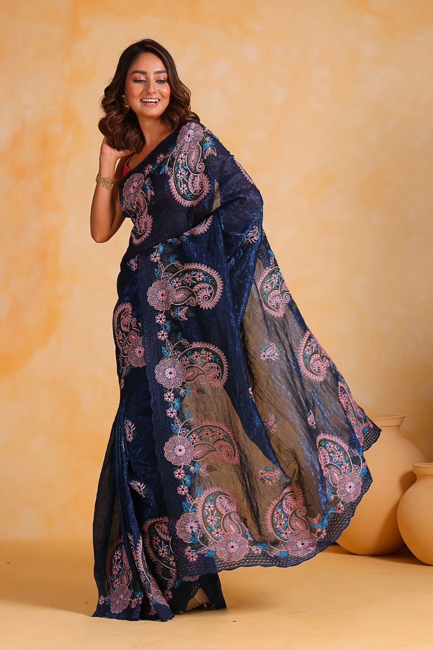 Pure Korean shimmer silk saree in a solid color with crushed and mainly embroidery viscos thread work in saree Paired with blouse of same color of saree with work border
