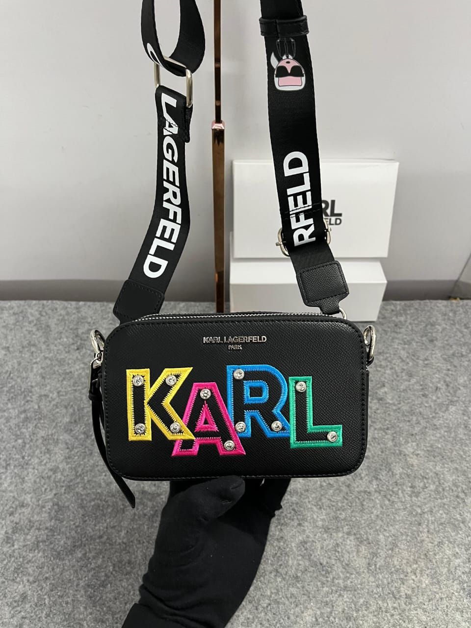 The Karl Lagerfeld K-Ikonik Camera Crossbody Bag is a trendy and playful accessory that combines fashion and function. Made with high-quality materials, this bag features the iconic K-Ikonik design with a fun, graphic portrait of Karl Lagerfeld himself. Its compact size makes it perfect for carrying your essentials, while the adjustable crossbody strap provides comfort and convenience. This bag is perfect for adding a touch of style and personality to your outfit.