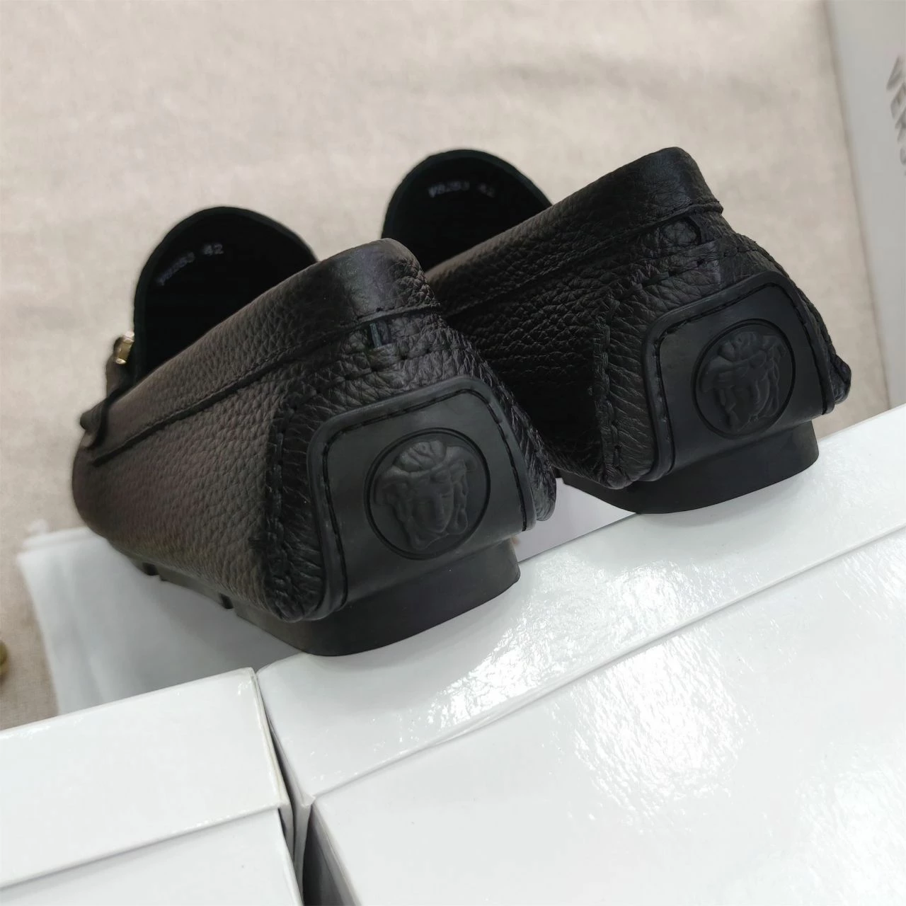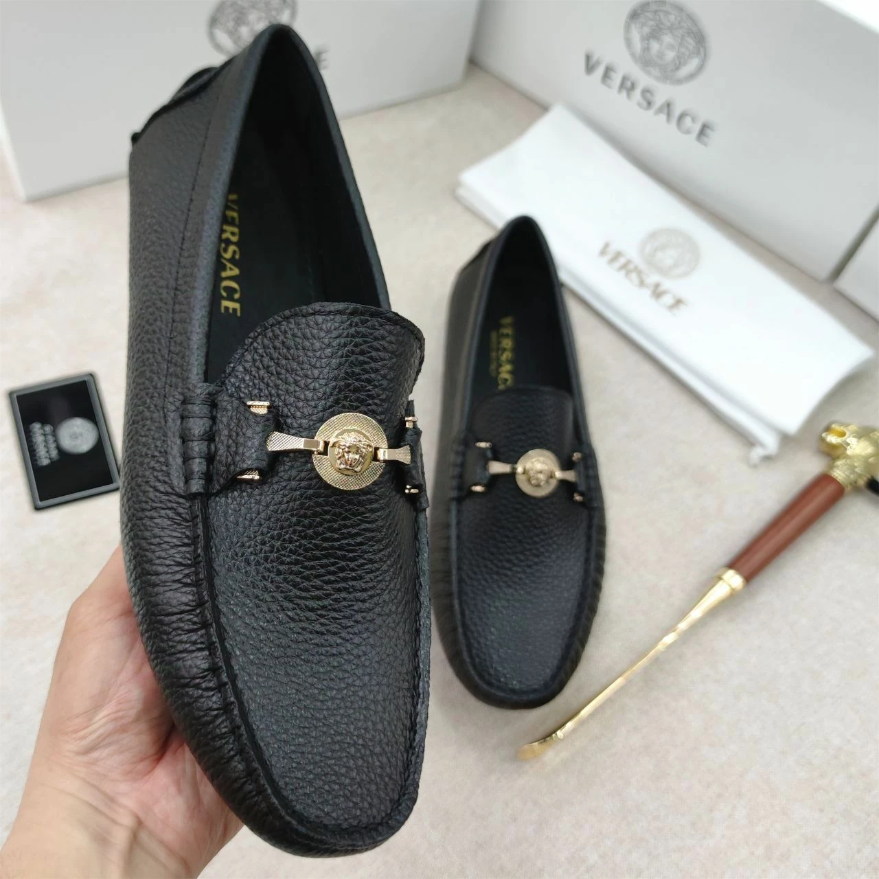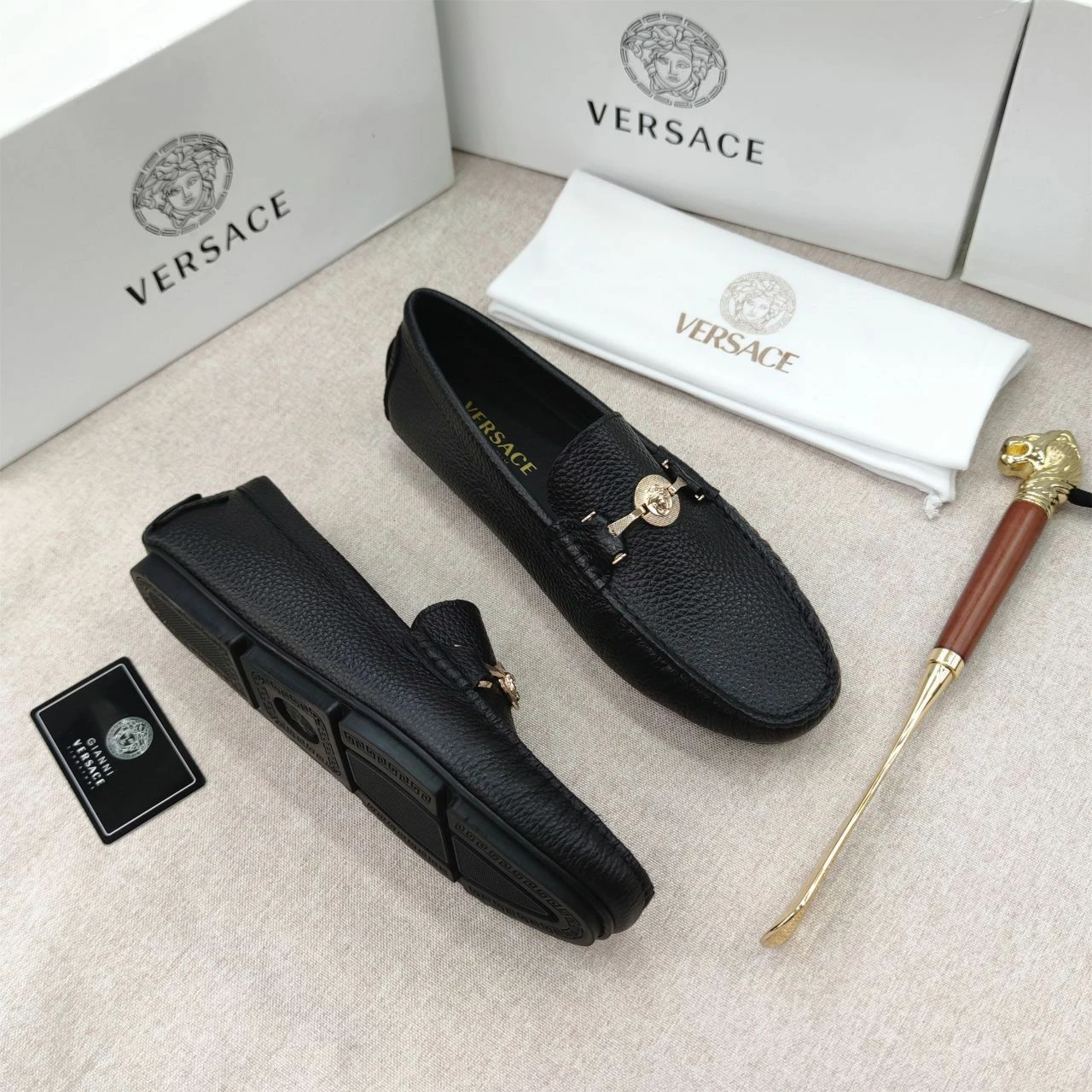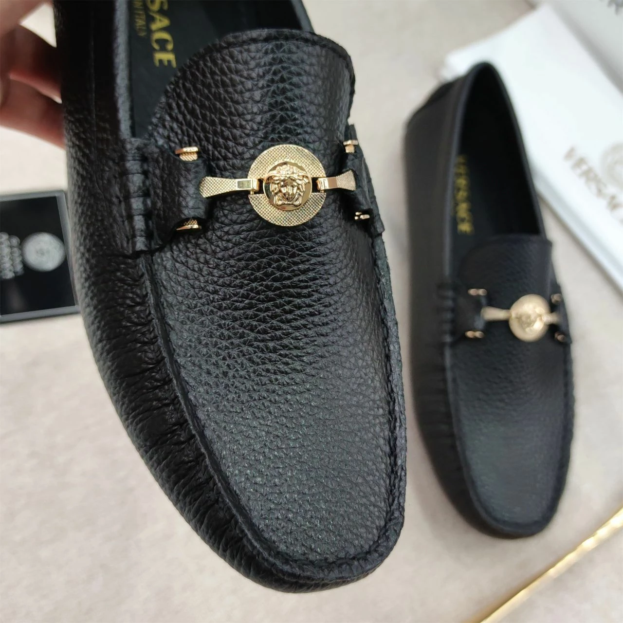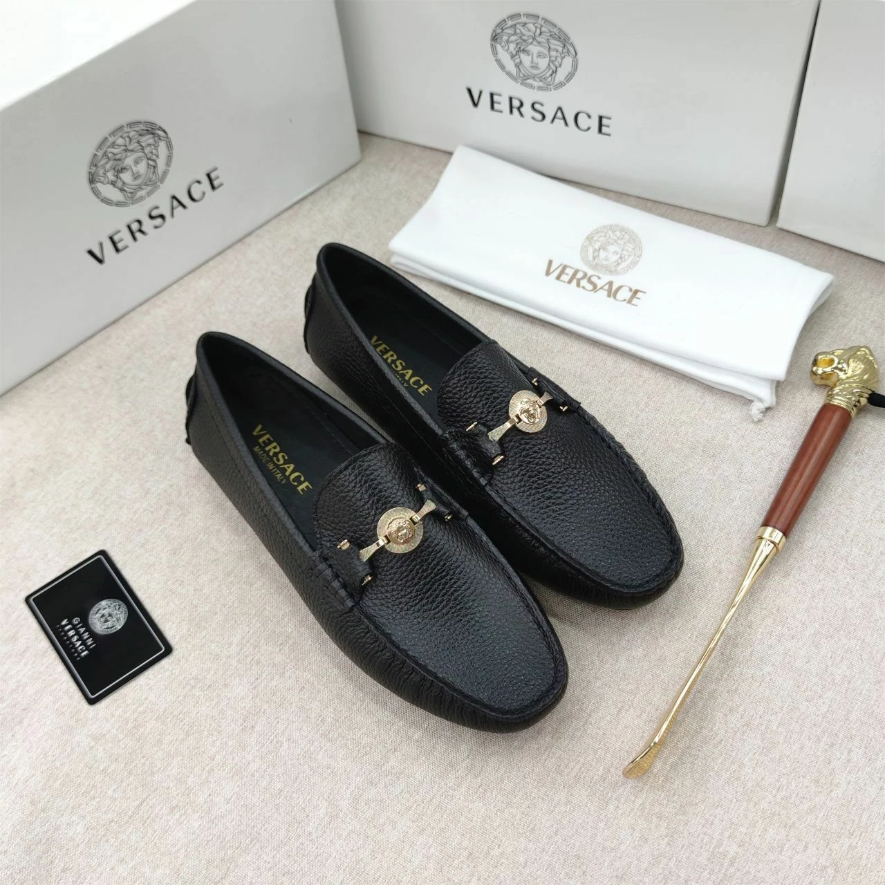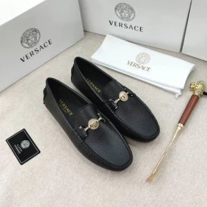 The VERSACE Medusa Black Leather Loafers for Men exude luxury and sophistication. Crafted from high-quality black leather, these loafers feature the iconic Medusa logo, adding a bold, stylish touch. The sleek and timeless design ensures both comfort and elegance, making them perfect for any occasion. Whether you’re dressing up for a formal event or adding a touch of class to a casual outfit, these loafers offer unmatched style and durability, reflecting Versace’s renowned craftsmanship.
