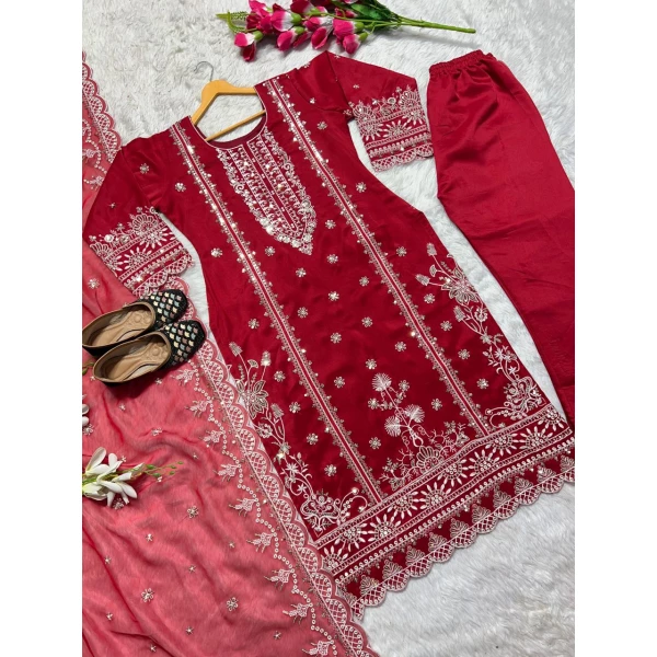 Women’s Chinnon Silk Embroidery Work Top-Bottom And Dupatta Set