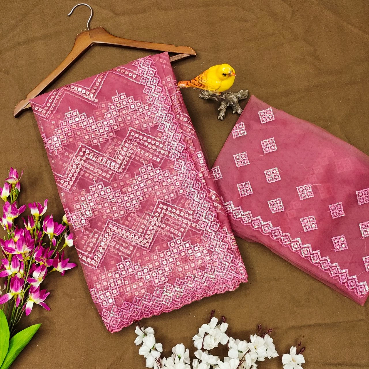 Women’s Pure Chinnon With Heavy Embroidery Sequence Work Top-Bottom And Dupatta Set