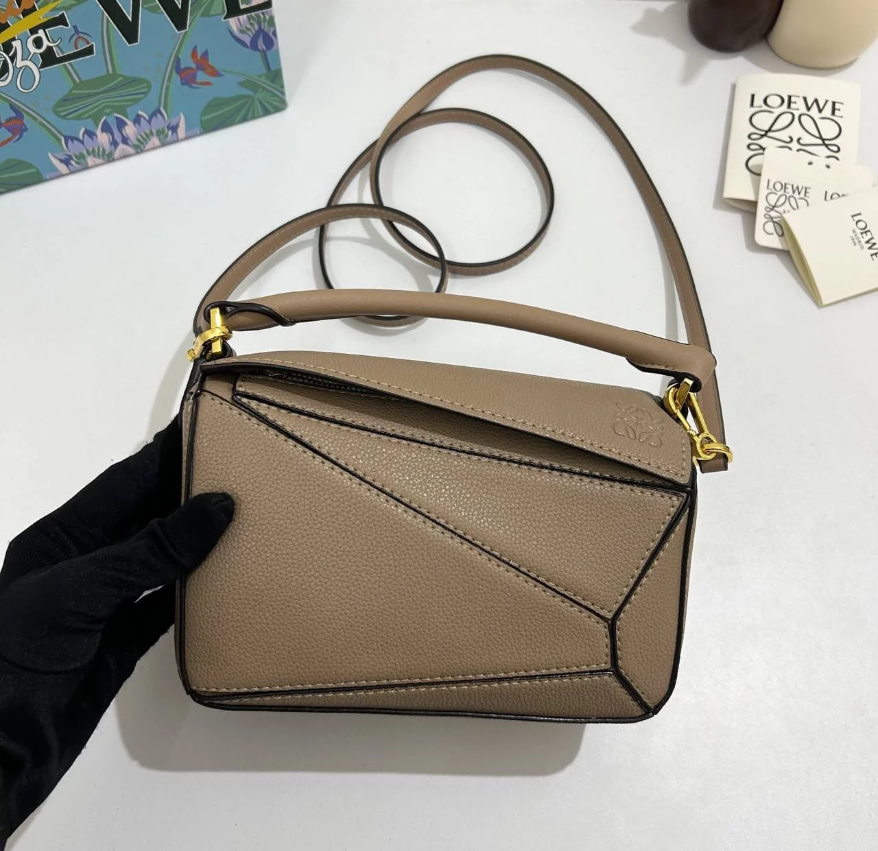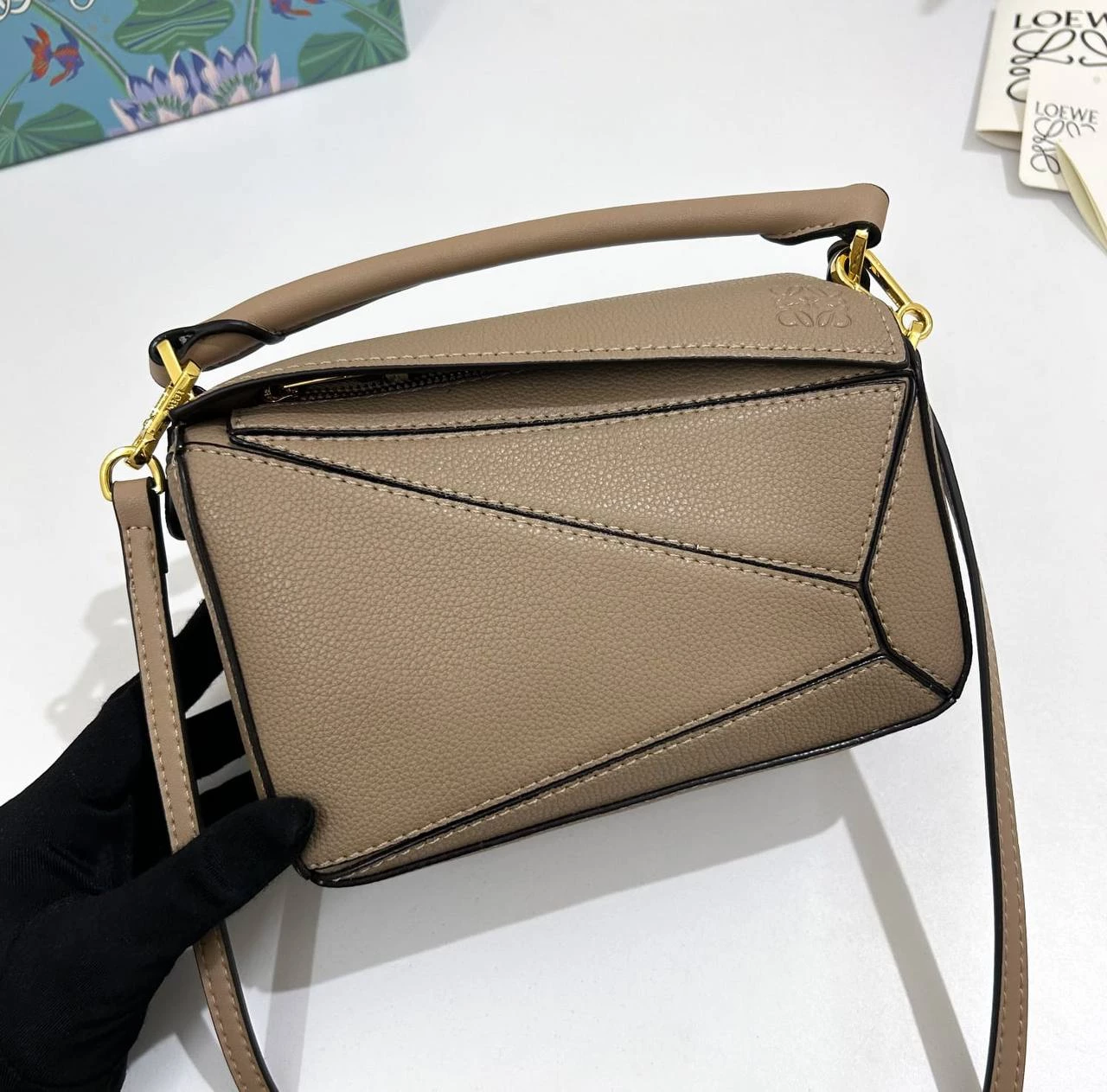 The Puzzle bag is the debut bag for LOEWE by Creative Director Jonathan Anderson. A cuboid shape and precise cutting technique create Puzzle’s distinctive geometric lines. This mini version is crafted in soft grained leather with overlapped edges.