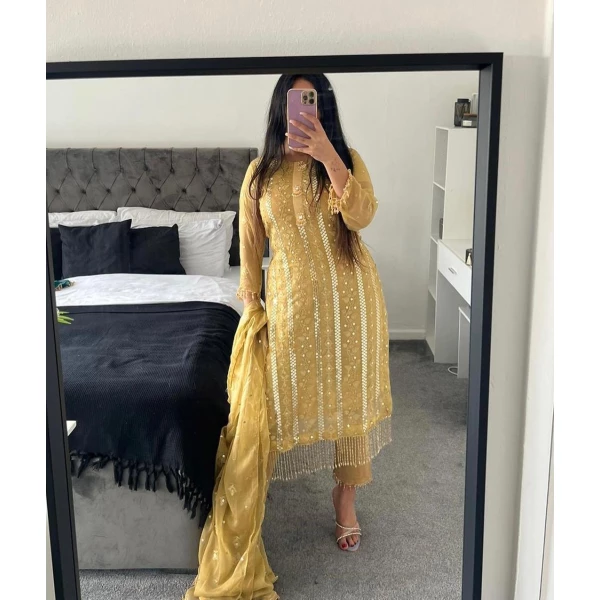 Long Top Fabric :- Hevay Faux Georgette Fabric With Heavy Embroidery 9mm Sequence Work With Moti Latkan Less . (Fully Sleeve’s)