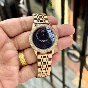 Stainless Steel 37mm Omega Premiums watch featuring a quartz movement, fixed daimonds studded bezel, Rose-tone and link bracelet with double deployant clasp.