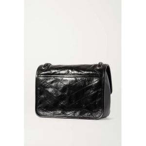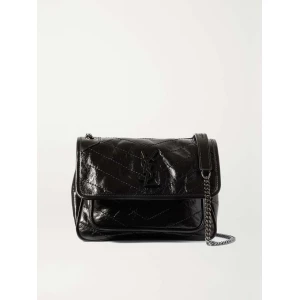 SAINT LAURENT’s ‘Niki Baby’ bag is purposefully crinkled and crackled to look like a vintage find. Made in Italy from glossed-leather, it has a sliding chain strap, so you can alter the drop and is topped with a tonal logo plaque. Despite its mini size, the compartmented interior will easily hold your cell phone, cardholder and compact.